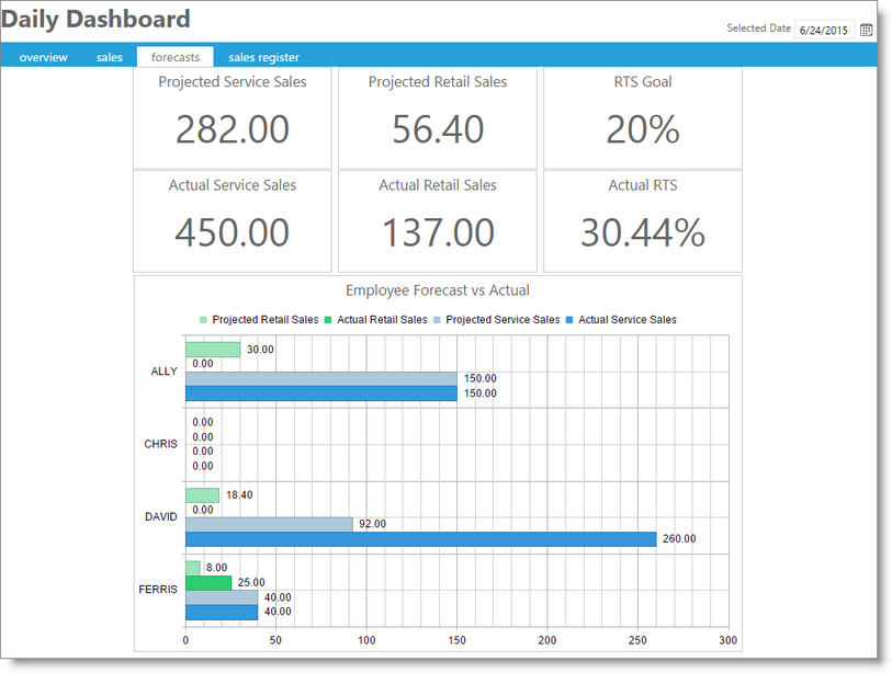 The Daily Dashboard is a quick and easy way to see critical business information for the day. This screen can be used as a reference on how the business is doing for a date. If the selected date is today's date, this shows the information as of the current time for today.