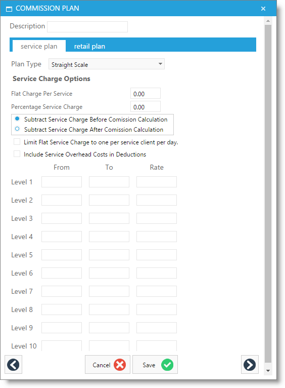 You can create a plan for service commission, retail commission, or both. Each can use an individual plan type (Services can be calculated on a straight scale, Retail can be calculated on a sliding scale on the same plan).