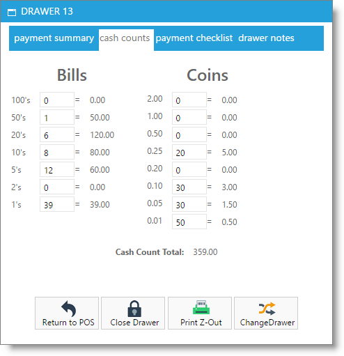 This screen helps you to count the cash and coins in the drawer. Enter the number of each denomination bill and coin in the spaces provided and the program will total the amount for you. As you enter bill and coin counts on this screen, they are automatically entered into the "Actual" Cash field on the "Payment Summary" screen.